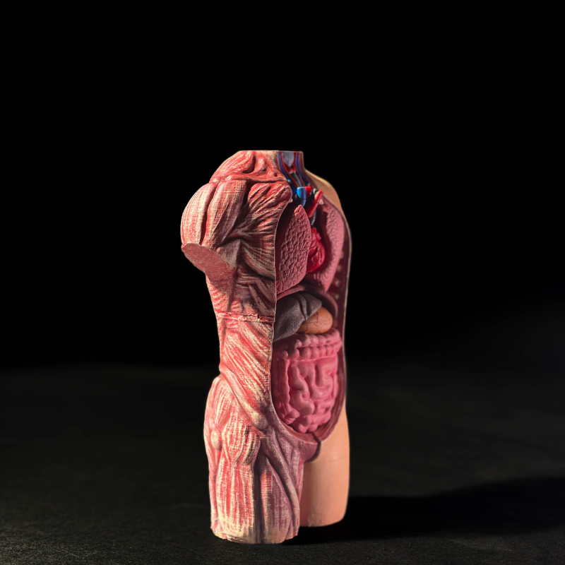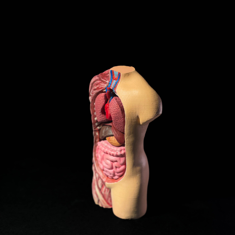 Anatomiczny model wydrukowany w 3D zawiera SIEDEM organów: serce, płuca, pęcherz moczowy, śledzionę, wątrobę, nerki i jelita.